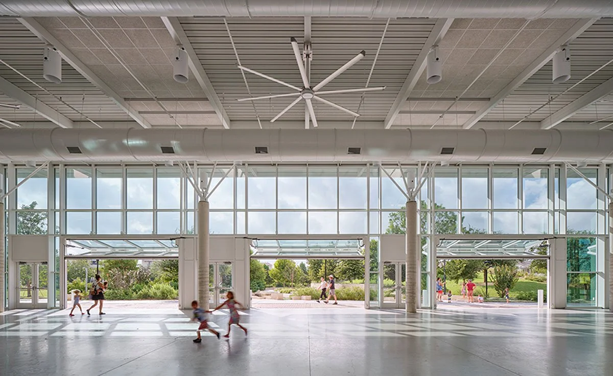 The Pavilion is adjacent to Branch Park and surrounded by local eateries, coffee houses, etc. It is completely enclosed, but the glass walls can be opened up in nice weather. Photo credits: Lawrence Group; Kathryn Ingram.